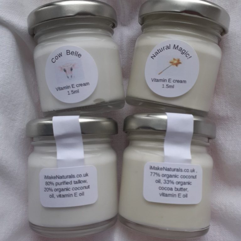 The Vitamin E Creams are simply food for your skin. Vitamin E restores and hydrates skin cells. It can be used on face, hands or body. A great idea is to use it before bed so the skin can absorb the nourishment while you sleep and your cells are regenerating.